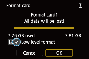 - Žemo lygio formatavimo metu formatavimą galite atšaukti pasirinkdami [Cancel/Atšaukti]. Net ir šiuo atveju bus atliktas įprastas formatavimas, tad galėsite kortele naudotis įprastu būdu.