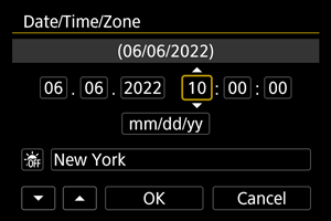 - Pakeitę parinkties [Zone/Time difference/Laiko juosta/laiko skirtumas] nuostatą, patikrinkite, ar teisingai fotoaparatas nustatė laiką ir datą.