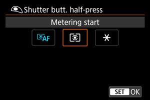 Kiekvienam matavimo režimui galite nurodyti, ar užfiksuoti ekspoziciją (AE fiksavimas), kai objektai sufokusuojami taikant vieno kadro AF režimą „One-Shot AF“. Ekspozicija būna užfiksuota, kol laikomas nuspaustas užrakto mygtukas iki pusės. Pasirinkite AE fiksavimui skirtus matavimo režimus ir pridėkite varnelę []. Pasirinkite parinktį [OK/Gerai] ir nuostatą užregistruokite.