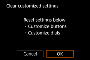 : Išvalyti visas pasirenkamas funkcijas (C.Fn)], išvalomos visos pasirenkamų funkcijų nuostatos, išskyrus nurodytas [Customize buttons/Tinkinti mygtukus] ir [Customize dials/Tinkinti ratukus].