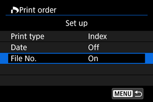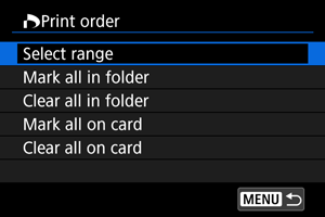 - RAW/HEIF vaizdų ir filmų nurodyti spausdinti negalima. Atminkite, kad RAW/HEIF vaizdų ir filmų negalima nurodyti spausdinti net ir nurodžius visus vaizdus pasirinkus nuostatą [Multiple/Keli].