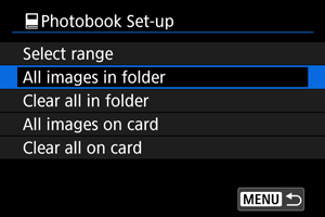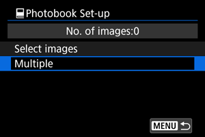 Visi aplanke arba kortelėje esantys vaizdai nurodomi fotoknygai spausdinti, kai pasirenkate nuostatą [All images in folder/Visi vaizdai aplanke] arba [All images on card/Visi vaizdai kortelėje] parinktyje [Multiple/Keli] (dalyje [: Photobook Set-up/