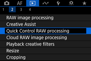 Galite pasirinkti RAW vaizdo apdorojimo, kuris atliekamas naudojantis sparčiojo valdymo ekranu, tipą.