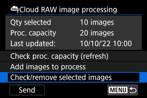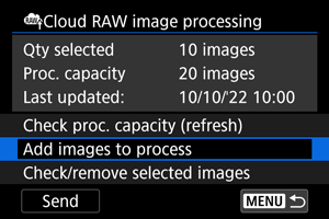 - Jeigu neįsigijote mokamos prenumeratos RAW vaizdams apdoroti debesyje, parinktyje [Proc. capacity/Apdorojimo pajėgumai] rodoma [0]. Informaciją apie prenumeratą gausite „image.canon“ nurodytu elektroninio pašto adresu, jeigu pasirinksite apdorojimo pajėgumus be prenumeratos.