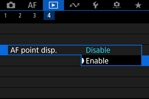 Gali būti rodomi AF taškai, kurie buvo naudoti fokusuotei pasiekti: jie peržiūros ekrane bus nurodomi raudona spalva.