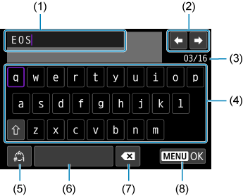 - (2) Žymiklio mygtukai, skirti judėti įvesties srityje