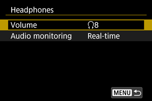 Galite pasirinkti garso įrašą filmavimo metu, kuris naudojamas klausytis per ausines. Norėdami sumažinti iškraipymus garso įraše, sukonfigūruokite parinktį [Audio noise reduc./Garso iškraipymų mažinimas] ().
