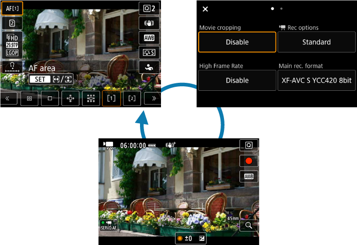 Kaip ir fotografuodami, paspauskite mygtuką , kad pasiektumėte sparčiojo valdymo ekraną. Kaskart paspaudus mygtuką