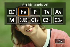 Suteikia galimybę automatiškai arba rankiniu būdu nustatyti išlaikymą, diafragmos reikšmę ir ISO jautrumą. Atitinka fotografavimą [P], [Tv], [Av] arba [M] režimu, todėl nereikia šių režimų įjungti.