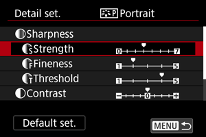 - Jei atlikdami 3 veiksmą pasirinksite [Default set./Numatytoji nuostata], atkursite numatytąsias atitinkamos „Picture Style“ sąrankos nuostatas.