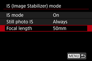 Šis meniu rodomas konfigūruojant fotoaparato IS režimo nuostatas, kai naudojami objektyvai be IS funkcijos. Naudojant objektyvus su vaizdo stabilizavimo funkcija, nustačius objektyvo vaizdo stabilizavimo jungiklį „Image Stabilizer“ į padėtį , derinamas objektyvo ir fotoaparato vykdomas stabilizavimas.