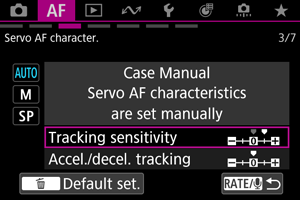 Galite nustatyti „Servo AF“ sekimo parametrus (objekto sekimo jautrumą ir greitėjimo / lėtėjimo sekimą), skirtą objektui ar fotografavimo situacijai.