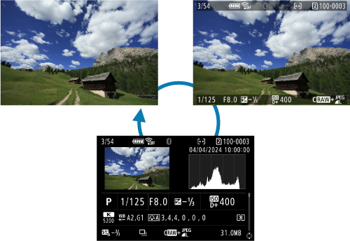 Kai rodomas fotografavimo informacijos ekranas (), galite paspausti aukštyn arba žemyn ir peržiūrėti kitą informaciją. Taip pat galite tinkinti, kokia informacija rodoma. Tai darykite parinktyje [