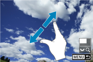 Fotoaparate yra jutiklinis ekranas, kurį galite paliesti norėdami valdyti peržiūrą. Palaikomi lietimo veiksmai panašūs į atliekamus naudojantis išmaniaisiais telefonais ir panašiais įrenginiais. Norėdami pasirengti peržiūrai naudojantis jutikliniu valdymu, pirmiausia paspauskite mygtuką .