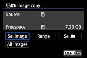 Jei paskirties aplanke arba kortelėje yra to paties numerio vaizdo failas, rodomos parinktys [Skip image and continue/Praleisti vaizdą ir tęsti], [Replace existing image/Pakeisti esamą vaizdą] ir [Cancel copy/Atšaukti kopijavimą]. Pasirinkite kopijavimo metodą ir paspauskite