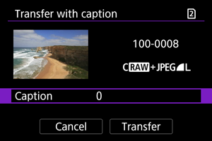 - Kitų vaizdų ekrane [Transfer with caption/Perdavimas su titrais] pasirinkti negalima. Norėdami pasirinkti kitą su titru perduotiną vaizdą, peržiūrėkite tą vaizdą prieš atlikdami nurodytus veiksmus.