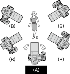 - Signalą priimančius fotoaparatus galima išdėstyti iki maždaug 50 m atstumu nuo signalą siunčiančio fotoaparato. Tačiau efektyvus diapazonas vykdant susietąjį fotografavimą gali būti mažesnis. Tai priklauso nuo belaidžio ryšio sąlygų, kurioms įtaką daro tokie faktoriai kaip fotoaparato pastatymo vieta, naudojimo aplinka ir oro sąlygos.