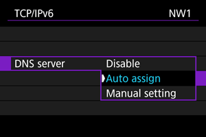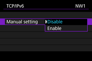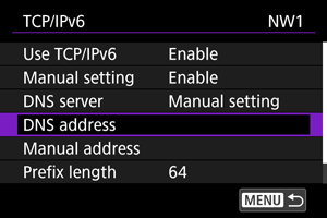 - Norėdami nustatyti IP adresą rankiniu būdu, pasirinkite [Enable/Įjungti]. Nustatoma parinkties [DNS server/DNS serveris] nuostata [Manual setting/Rankinis nustatymas] ir galite konfigūruoti parinktis [DNS address/DNS adresas], [Manual address/Rankiniu būdu nustatomas adresas], [Prefix length/Priešvardžio ilgis] ir [Gateway/Tinklų sietuvas].