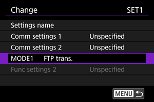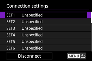 Ryšio nuostatas, kuriose naudojamas laidinis LAN ryšys, užregistruokite kaip nurodyta toliau. Norint naudoti laidinį LAN su fotoaparatu, reikalingas baterijų blokas BG-R20EP arba aušinimo ventiliatorius CF-R20EP (abu parduodami atskirai).