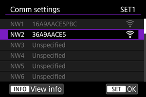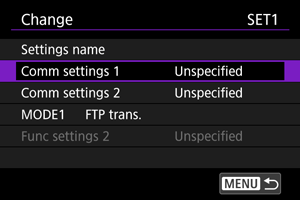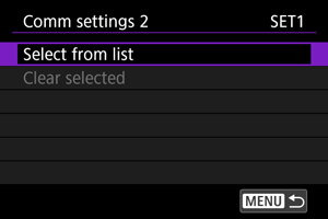 - Pasirinkite „Wi-Fi“ nuostatas, jei laidinio LAN nuostatos jau užregistruotos [Comm settings 1/Ryšio nuostatos 1], arba pasirinkite laidinio LAN nuostatas, jei „Wi-Fi“ nuostatos jau užregistruotos [Comm settings 1/Ryšio nuostatos 1].