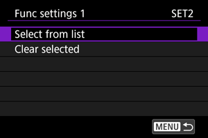 Pasirinkus [Select from list/Pasirinkti iš sąrašo], sąrašo pavidalu pateikiamos fotoaparate įrašytos funkcijų nuostatos. Pasirinkite naudotinas funkcijų nuostatas.