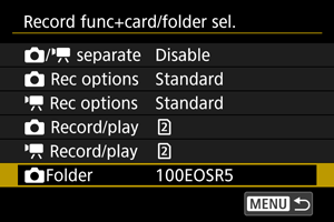 - Aplankai pavadinami naudojant formatą 100EOSR5, kai už trijų skaitmenų aplanko numerio eina penkios raidės arba skaitmenys. Aplanke gali būti iki 9999 vaizdų (failo Nr. 0001–9999). Aplankui prisipildžius, bus sukurtas naujas aplankas, kurio numeris bus vienetu didesnis nei ankstesniojo. Be to, naujas aplankas automatiškai sukuriamas ir tuo atveju, jei yra atliekama rankinė atstata (). Gali būti sukurti aplankai, su numeriais nuo 100 iki 999.
