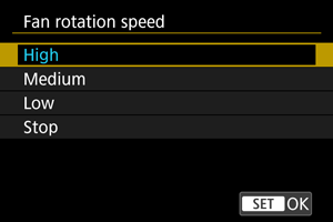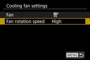 Aušinimo ventiliatoriaus nuostatas galima konfigūruoti fotoaparatu, kai naudojamas pasirinktinis aušinimo ventiliatorius. Prieš konfigūruodami nuostatas prijunkite aušinimo ventiliatorių ().