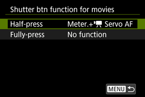 Galite nustatyti filmuojant atliekamas funkcijas, kai užrakto mygtukas nuspaudžiamas iki pusės arba iki galo.