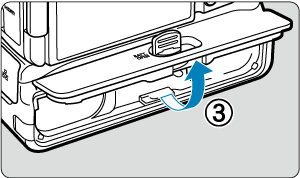 - Kai vėl prijungiate baterijų skyriaus dangtelį prie fotoaparato, prijunkite jį atidarytą bent 90°.