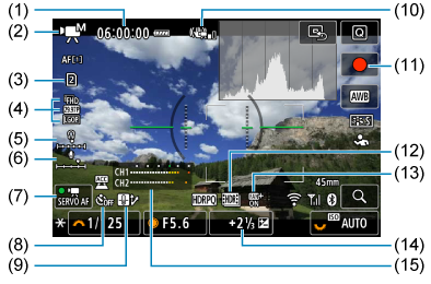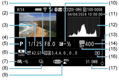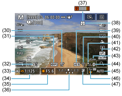 - (5) Pasirinktinis vaizdas / „Picture Style“ sąranka (vaizdo charakteristikos / nuostatos informacija)