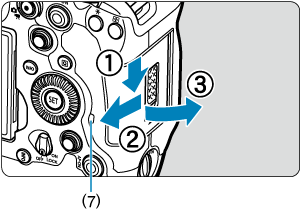 - Kai kortelės lizdo dangtelio užraktas (1) pastumtas link atleidimo pusės, patraukite kortelės lizdo dangtelį link savęs, kad atidarytumėte.