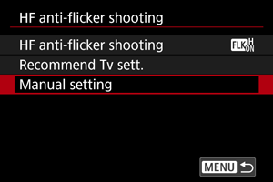 Pasirinkite parinktį [HF anti-flicker shooting/Fotografavimas sumažinant didelio dažnio sukeliamą mirgėjimą].