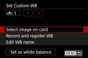 - Ekrane [Set Custom WB/Pasirenkamo baltos spalvos balanso nustatymas] pasirinkite užregistruoto pasirenkamo baltos spalvos balanso numerį, kad galėtumėte suteikti pavadinimą.
