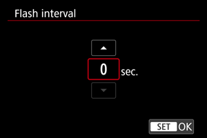 - Nustačius [0], suderinamos „Speedlite“ blykstės sužybsi ir fotoaparatas fotografuoja, kai tik „Speedlite“ blykstės visiškai įkraunamos. Suderinamų „Speedlite“ blyksčių naudotojo vadove rasite atsargumo priemonių dėl nepertraukiamo fotografavimo. Apsvarstykite galimybę nustatyti ilgesnį intervalą, kai naudojate kelias suderinamas „Speedlite“ blykstes fotografuodami su belaide blykste.