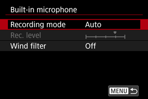 Galima rinktis, kai naudojamas įmontuotas mikrofonas arba prie daugiafunkcinės jungties jungiami mikrofonai, suderinami su vėjo filtrais.