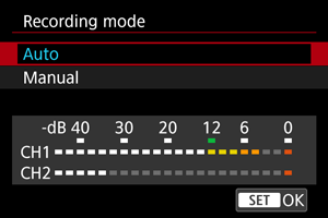- Įrašymo lygiai rodomi lygio matuoklyje ekrano apačioje.