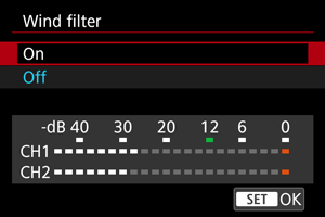 Nustatykite nuostatą [Enable/Įjungti], kad sumažintumėte vėjo keliamą triukšmą, kai lauke vėjuota. Kai vėjo filtro funkcija suaktyvinama, sumažėja ir dalis žemų garsų.