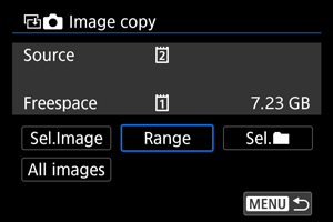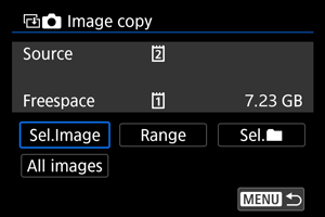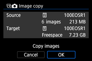 Jei paskirties aplanke arba kortelėje yra to paties numerio vaizdo failas, rodomos parinktys [Skip image and continue/Praleisti vaizdą ir tęsti], [Replace existing image/Pakeisti esamą vaizdą] ir [Cancel copy/Atšaukti kopijavimą]. Pasirinkite kopijavimo metodą ir paspauskite
