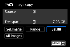 - Naudojantis nuostata [Sel.Image/Pasirinkti vaizdą], vienu metu negalima nukopijuoti keliuose aplankuose esančių vaizdų. Pasirinkite vaizdus vienu metu kopijuoti iš vieno aplanko.