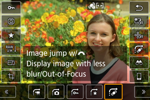 - Jokios piktogramos ar aptikimo rėmeliai, žymintys suliejimo kiekį, nerodomi peržiūrint vaizdus, užfiksuotus taikant RAW+JPEG arba RAW+HEIF fotografavimą, nes šios peržiūros metu naudojami RAW vaizdai. Norėdami peržiūrėti piktogramas arba aptikimo rėmelius, žyminčius suliejimo kiekį, kai nustatyta parinkties [