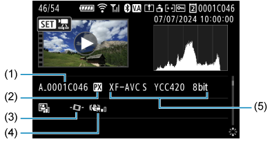 - (5) Pasirinktinis vaizdas / „Picture Style“ sąranka (vaizdo charakteristikos / nuostatos informacija)