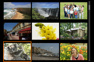 prieš laikrodžio rodyklę, 9 vaizdų rodinį pakeis 36 vaizdų ir 100 vaizdų rodiniai. Sukant ratuką pagal laikrodžio rodyklę, rodiniai ekrane keičiasi nuo 100, 36, 9, 4 iki vieno vaizdo rodymo.