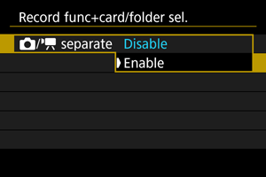 Pasirinkite [Enable/Įjungti], kad būtų automatiškai konfigūruojamas nuotraukų ir filmų įrašymo metodas. Filmai įrašomi į kortelę , o nuotraukos – į kortelę