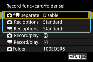 Įrašymo parinktys] nuostata [Rec. separately/Įrašyti į atskiras korteles] / [Rec. to multiple/Įrašyti į kelias korteles] arba parinkties [
