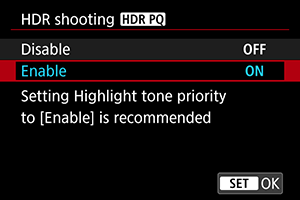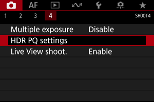 HDR PQ iestatījumi ļauj kamerai veidot HDR attēlus, kas atbilst PQ specifikācijai, kas norādīta funkcijām ITU-R BT.2100 un SMPTE ST.2084 (faktiskais rādījums ir atkarīgs no monitora veiktspējas).