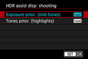 Norādiet iestatījumu [HDR assist disp: shooting/HDR palīgrādījums: uzņemšana].