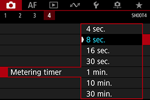 Var iestatīt, cik ilgi mērīšanas taimeris darbojas (kas nosaka ekspozīcijas rādījuma/AE fiksācijas ilgumu) pēc tam, kad to palaiž, līdz pusei nospiežot aizslēga pogu vai tml.