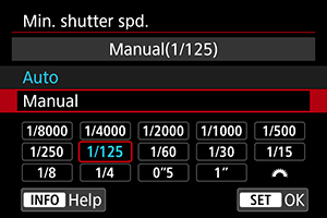 Izvēlieties [Min. shutter spd./Maksimālais ekspozīcijas laiks].