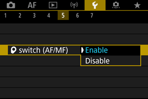 Kad ir pievienots RF objektīvs bez fokusēšanas režīma slēdža, varat konfigurēt kameras fokusēšanas režīma slēdža darbību.