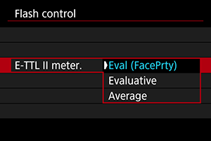 Cilvēku fotografēšanai piemērotai zibspuldzes mērīšanai iestatiet uz [Eval (FacePrty)/Izvērtējošā (sejas prioritāte)].